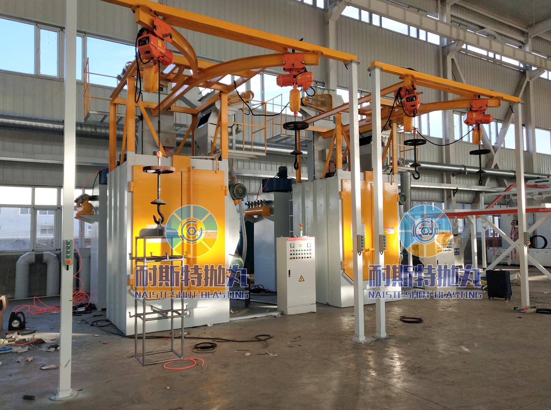 吊鉤式拋丸機(jī)結(jié)構(gòu)緊湊,外形尺寸小,且可以無地坑安裝,易于裝卸,運(yùn)輸與裝置調(diào)試使用的范圍廣。采用具有大拋丸量、高拋射速度的新型拋丸器,能高效且快速的提高拋丸清理效率,有著較好的質(zhì)量。一般376或者378型吊鉤式拋丸機(jī)采用了二臺(tái)曲線葉片直聯(lián)式拋丸器,效率高,效果好,性能也算不錯(cuò)的。