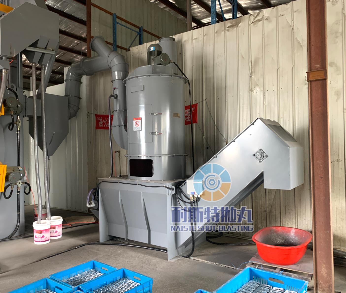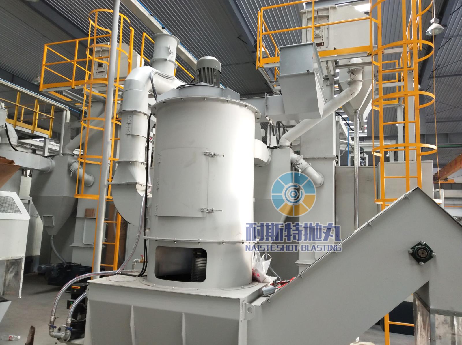 利用除塵風機將含有粉塵的空氣吸入濕式除塵系統(tǒng)的進風口,利用文丘里原理及星形卸料器將大顆粒粉塵進行初步過濾分離,排出至本系統(tǒng)的預排塵箱。余下含有細顆粒的空氣進入正式水霧除塵的后續(xù)處理,在水霧與粉塵的充分混合后,含塵污水流入過濾水箱,通過沉淀形成淤泥,淤泥通過刮泥系統(tǒng)刮出到裝泥小車,污水通過污水處理系統(tǒng)凈化后再循環(huán)使用。